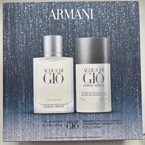 Armani Acqua di Giò sæt indeholder en deodorant spray og en shower gel. Produkterne er designet til mænd og leveres i en gaveæske. Helt ny og uåbnet, hentes i Kokkedal, sender ikke.