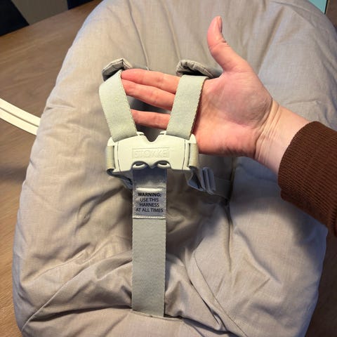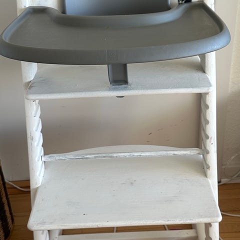 Stokke tripp trapp højstol i grå farve. Højstolen er designet til børn og inkluderer et gråt ryglæn, bøjle og bord. Desuden "lomme" til at sætte bag på stolen. Den har lidt brugsspor og trænger måske til en klud, men er i god og pæn stand.