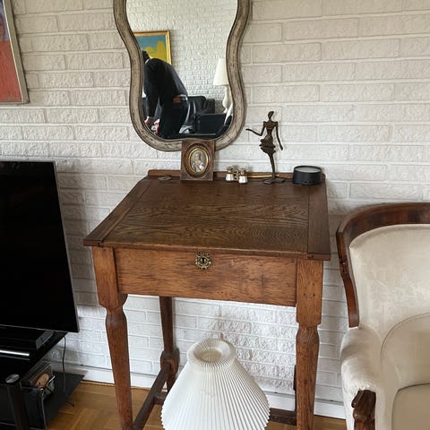 Gammel pult i træ. Planen om at sætte den i stand er ikke blevet til noget og derfor må den videre.