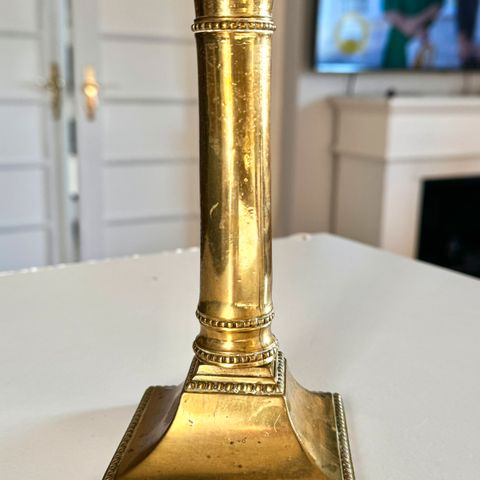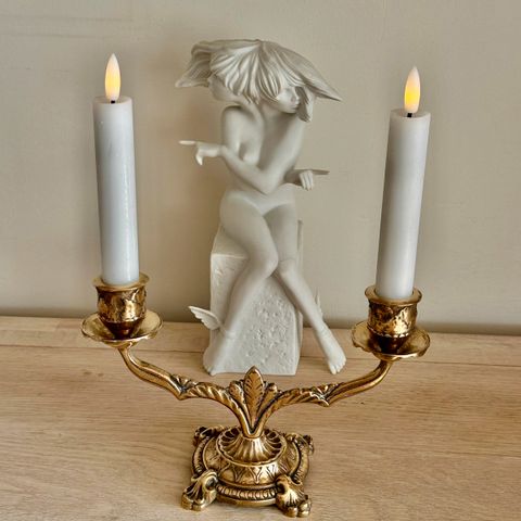 Flot trearmet messing lysestage sælges. Har været i familien siden 1940erne.. Fin og dekorativ.