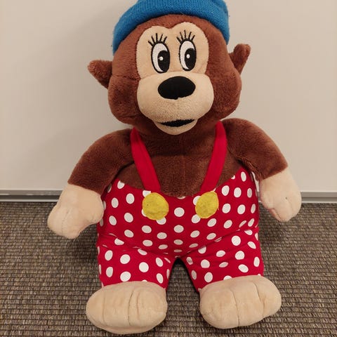 Rasmus Klump bamse (ca 32 cm) med rød polkaprikket tøj og blå hue. Der står Syd Bank på hans top hue. I god stand. Har mest siddet som dekoration. Har alm aldersrelaterede brugsspor. Alder ukendt.