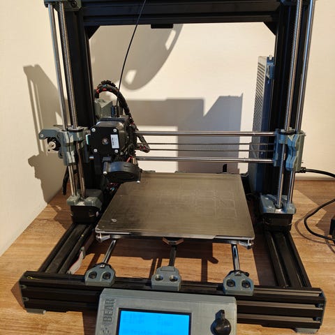 Prusa i3 MK3 3D-printer med hjemmebygget lukket kabinet og LED-belysning. Udstyret med RaspberryPi der gør at man kan starte og følge print over internettet. Dyse i hærdet stål, så man kan printe i specielle filamenter.