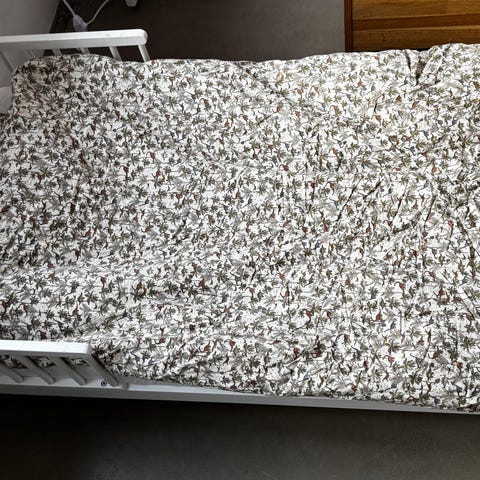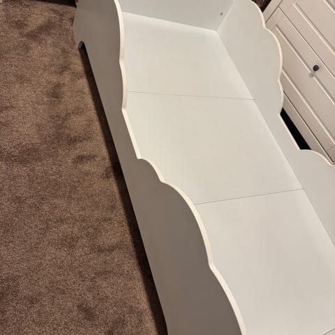 JLY Juniorseng i hvid. Sengen er designet til børn og har en robust ramme med tremmesider. Den er egnet til brug som juniorseng i børneværelset.