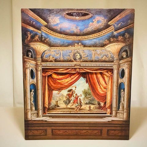 Sæt med vintage papirdukker og teaterrekvisitter, herunder forskellige figurer, scener og tilbehør. Indeholder flere små dele i pap og papir, der kan bruges til samling eller dekoration. Materialer omfatter papir og pap, og elementerne viser ældre design og illustrationer. Træstykker til at sætte forskellige scener op. Originale teaterstykker fra 1920.