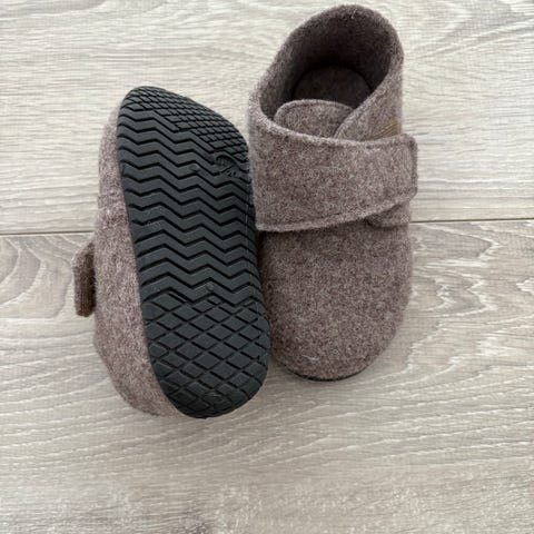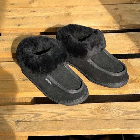 Næsten nye grå Wollies W ruskinds hjemmesko med skindsål i original æske.