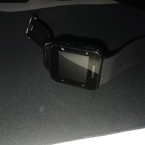 Garmin Forerunner GPS smartwatch med sort rem og skærm. Uret har GPS-funktion til tracking af aktiviteter og træning. Remmen er lavet af holdbart materiale, og uret er designet til brug under sport og udendørs aktiviteter.