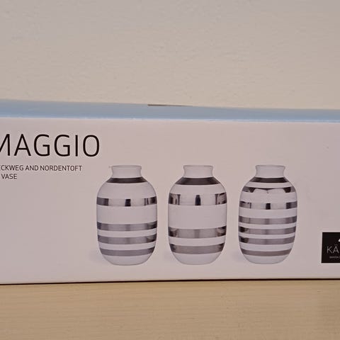 Sæt á tre stk Kähler Omaggio miniature vaser i hvid porcelæn. Vaserne har et enkelt og tidløst design med striber i hvid perlemor-finish. Sættet leveres i original emballage.