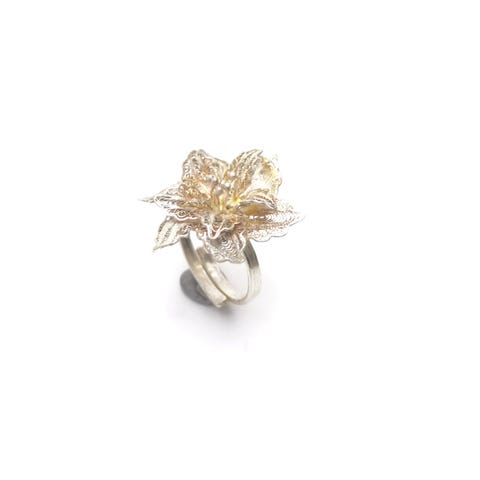 Elegant ring i sølv med en detaljeret blomsterdekoration. Ringen har en unik og iøjnefaldende design, der vil tilføje et sofistikeret touch til ethvert outfit. Udsmykning måler 2 cm i diameter og ring størrelsen er 59. Ringen fremstår med skævheder og mærker på ringskinnen utydelig stemple.