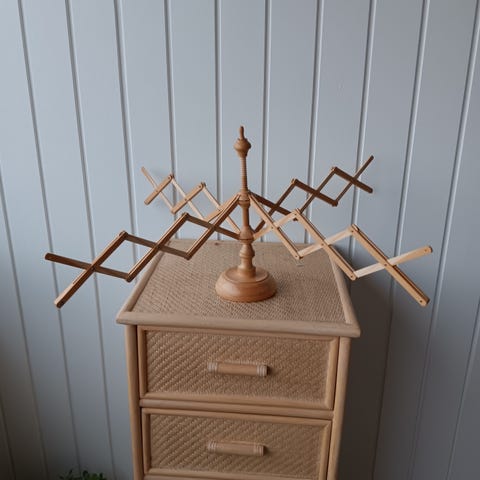 Gammeldags flot grøn garnvinde sælges. Den fejler intet, men hjulene kan med fordel smøres. Den er til at man kan vinde to tråde op samtidig, eller hvor man er to og kan sidde sammen og vinde garn op