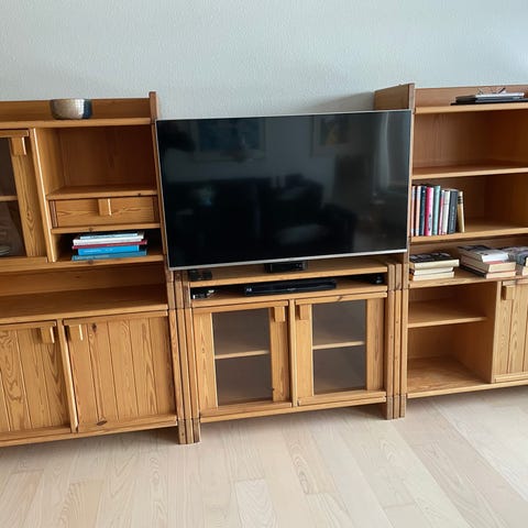 Reol med vitrineskab i fyrretræ sælges.