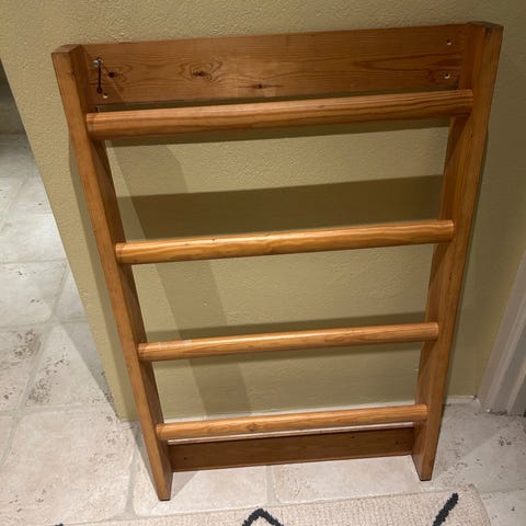 Kan skilles ad på midten. Der medfølger skruer og trædybler så den er lige til at sætte sammen.