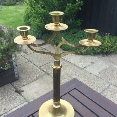 Smuk klassisk messingstage til bloklys. Til lys med en diameter på ca. 5 cm. Højden er ca. 6 cm og foden er 11 cm.