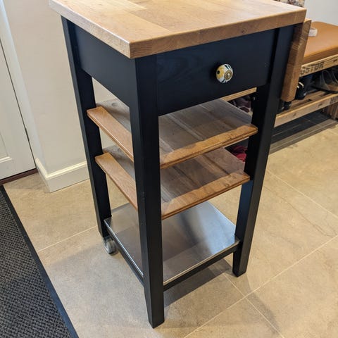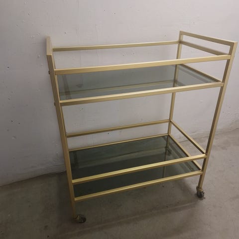 Tror det er en gamle IKEA Sunnersta Bar Cart/ Rullebord i hvid metal med tre hylder. Er i god stand men brugt.
