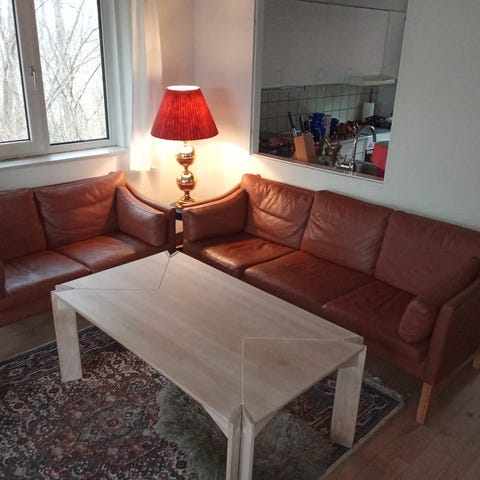 Sælger en rigtig pæn og velholdt sofagruppe i sort ægte læder. Består af en 3-personers sofa samt to lænestole. Meget komfortabel at sidde i – god støtte i ryg og armlæn, og læderet er stadig blødt og i flot stand.