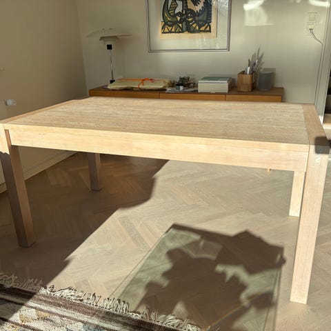 Pænt hvidt spisebord. Der er 2 tillægsplader på 40 cm hver - de er ikke så pæne men fungerer.