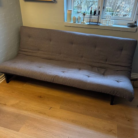 Grå stofsovesofa i rigtig fin stand. Med opbevaringsrum under sædet.