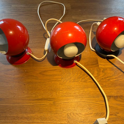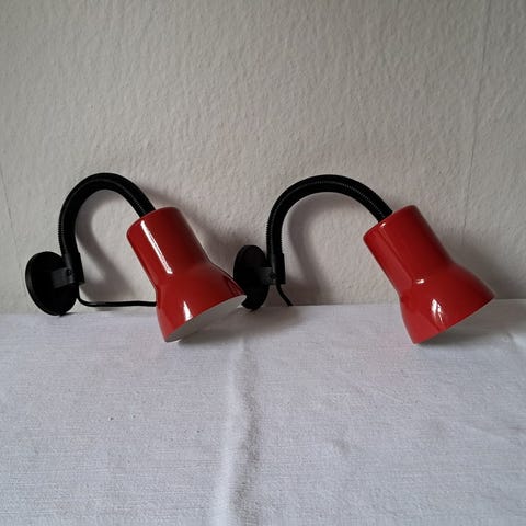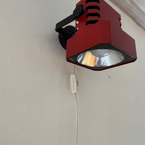 Ældre læselampe i flot design, beregnet til at sætte på væggen. Højde 17 cm, i alt med ophæng 24 cm,m diameter 17 cm. Materiale metal og plastik.