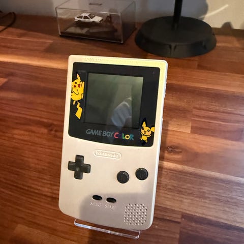 Nintendo Game Boy Color håndholdt spillekonsol med transparent kabinet. Konsollen har en farveskærm og er kompatibel med Game Boy-spil. Medfølgende spil inkluderer flere Pokémon-spil og et fodboldspil. Designet til bærbar brug.