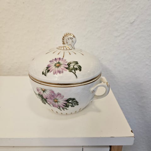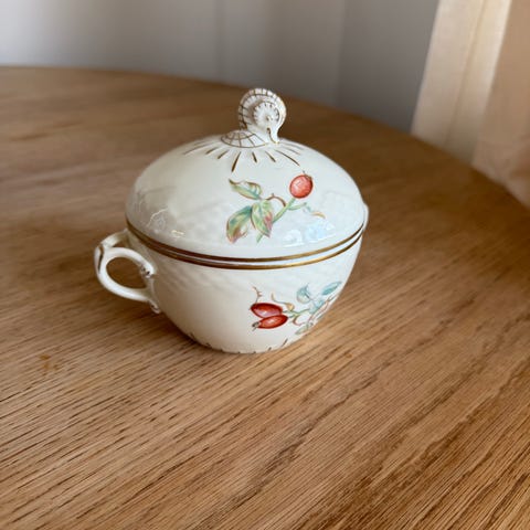 Bing & Grøndahl sukkerskål med låg i blå porcelæn. Skålen har to håndtag og en dekorativ knop på låget. Produktet er velegnet til opbevaring af sukker eller lignende i køkkenet.