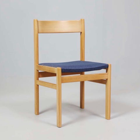 4 virkelig flotte spisestole i massiv fyrretræ med mørkeblåt stof. I meget pænt med mindre brugsrelaterede mærker.