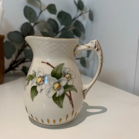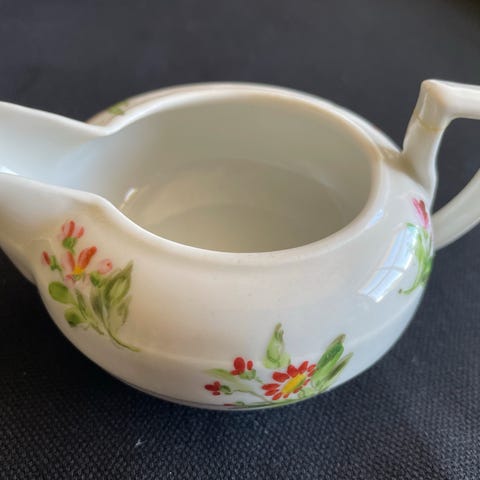 Flødekande no 189 og sukkerskål no 94 fra B og G sukkerskålen har en lille ubetydelig revne som vist på billedet der af prisen. Der følger en kop med lille ubetydelig revne og underkop med hvis det ønskes. Prisen samlet 125