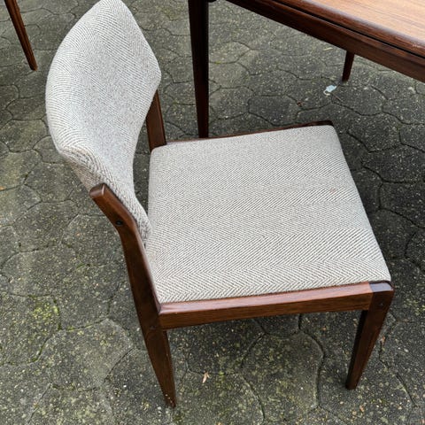 5 palisander spisebordsstole med sort læder. Siddehøjde 42 cm. Godt brugte, en af stolenes ryglæn er meget slidt. Sælges samlet
