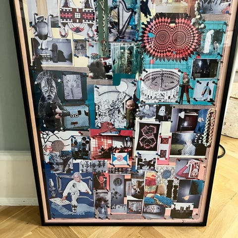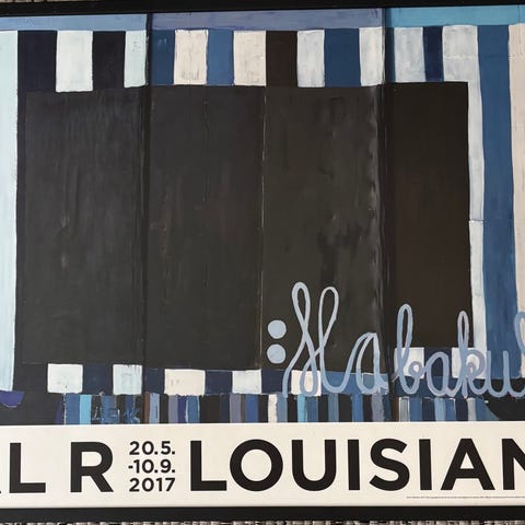 Louisiana-plakat med værket, Adieu Interessant (silver), (2005-2008) af den danske kunstner, Tal R (f. 1967). Tal R viser her sin optagethed af collagens lag på lag med en eksplosion af farver og udklip - et værk, han arbejdede på gennem flere år.