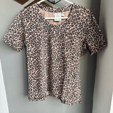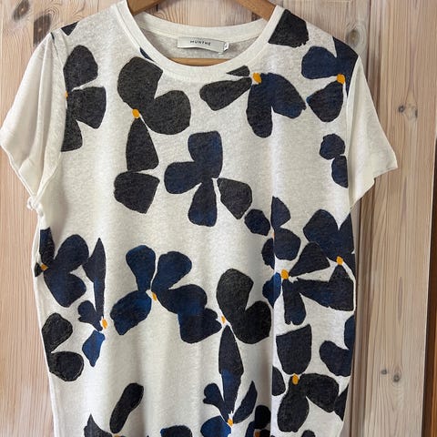 Munthe T-shirt til kvinder i størrelse M. T-shirten er lavet af bomuld og har et multifarvet design med brun og beige farve. Den har tryk på både for- og bagside.