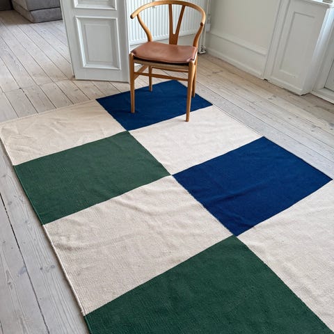 140x200 cm er et håndvævet tæppe i 100% uld fra danske HAY. Det flotte tæppe består af små aflange "klodser" med smukke nuancer, der giver det et livligt udtryk.