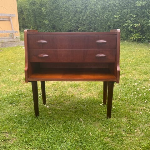 Smukt og tidløst sengebord med skuffe og flettet hylde i klassisk retrodesign. Perfekt som natbord, sidebord i stuen eller lille konsol i entréen. Solid kvalitet og varm træfinish, der passer ind i både moderne og retro hjem. Fremstår med brugerspor som kan ses på billederne.