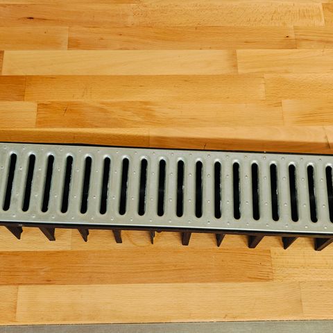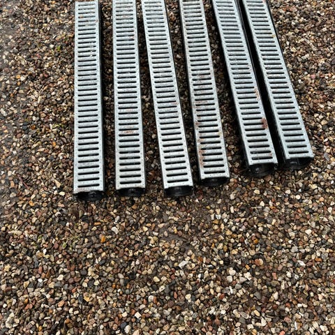 Afvandingssæt til regnvand, ialt (6 m) dvs. 2 sæt bestående af 3 stk. 1 meter rende inkl. rist, 2 afslutningsstykker og afløbsstuds for evt. tilslutning af 75/110 mm rør.