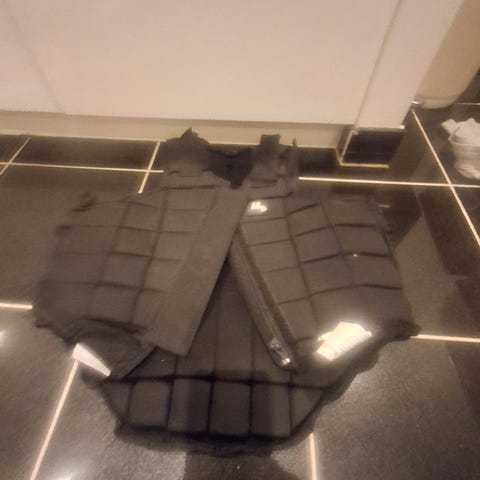Pro Rider Prallschutz 3000 Level 3 vest i størrelse A-S. Vesten er designet til beskyttelse med et niveau 3 sikkerhedsniveau. Materialet og farverne fremgår af billederne, og vesten har justerbare stropper for bedre pasform.
