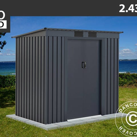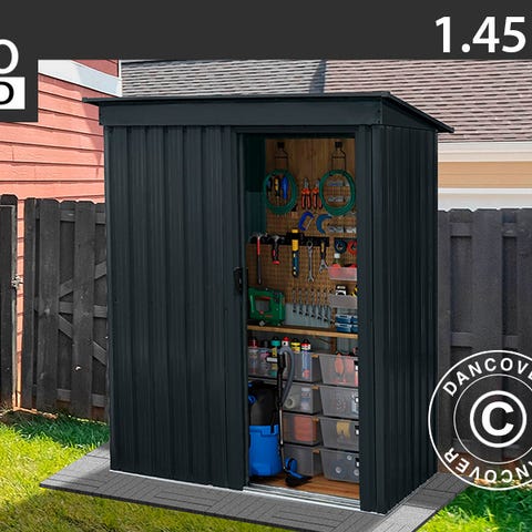Outdoor redskabsskur i beige og brun farve. Skuret har dobbelte døre. Indvendigt er der plads til opbevaring af haveredskaber eller andet udstyr. Skuret står i Glostrup og kan evt. leveres mod betaling