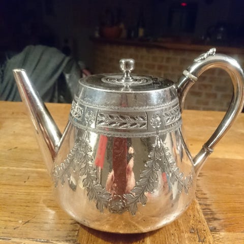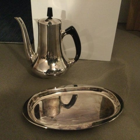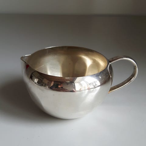 Smuk vintage Art Deco kande stemplet “ALP Denmark” (Cohr Sølvvarefabrik). Fremstillet i kraftig sølvplet (ATLA) med elegant, tidstypisk design. Flot stand med naturlig patina. Perfekt som serveringskande eller dekorativt indslag.