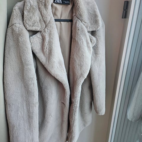 Zara Frakke i størrelse XS til kvinder. Frakken er fremstillet af pelsmateriale og har en grå farve.