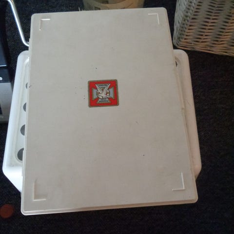 Zone Redningskorps Nød Forbindingskasse indeholder noget førstehjælpsudstyr som flasker og forbindinger i en rød metalæske. Æsken er beregnet til opbevaring af materialer til nødsituationer og førstehjælp. Da der bruges aa og ikke å, vurderer jeg, at selve kassen er fra før 1948 (indholdet er nyere - bl.a. er førstehjælpsbogen fra 1964 - men immervæk også en alder.