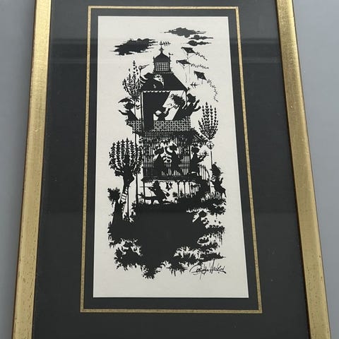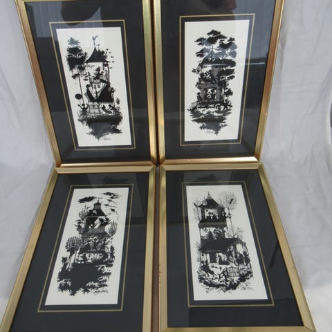 Indrammede billeder af de 4 årstider fra Bjørn Wiinblad, måler 31.5 cm x 26 cm hver. I gyldne rammer.