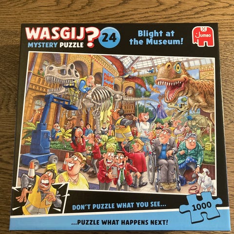 Wasgij 24 Destiny Puzzle med 1000 brikker. Puslespillet har temaet 'Business as Usual' og udfordrer brugeren til at pusle fremtiden baseret på nutidige scener. Indeholder detaljerede illustrationer med en humoristisk tilgang til hverdagssituationer på kontoret.