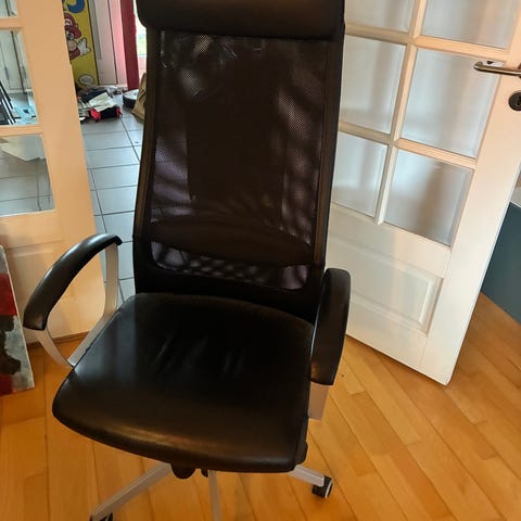 IKEA kontorstol med sort netryg og polstret sæde. Stolen har armlæn, justerbar højde og hjul til nem bevægelse. Designet til kontorbrug med fokus på komfort og ventilation. Køber skal selv afhente stolen.