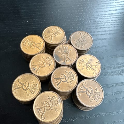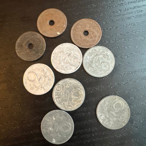 1-øre, 2-øre, 5-øre fra 1902-1984. Sælges kun samlet