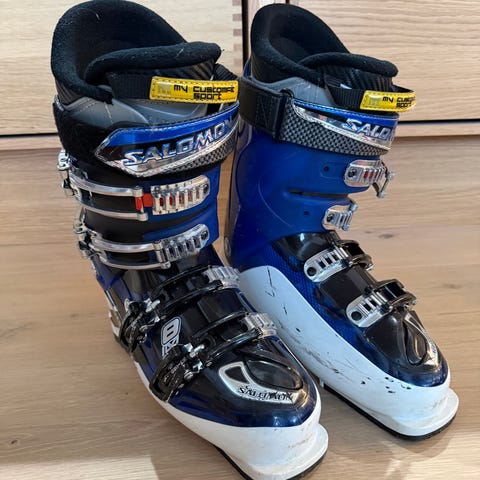 Salomon skistøvler i hvid farve med termo i. Har altid holdt varmen i dem. Der er ilagt en sholl sål, da jeg havde for meget plads i foden. Brugt 5-6 uger, men stadig rigtig gode.