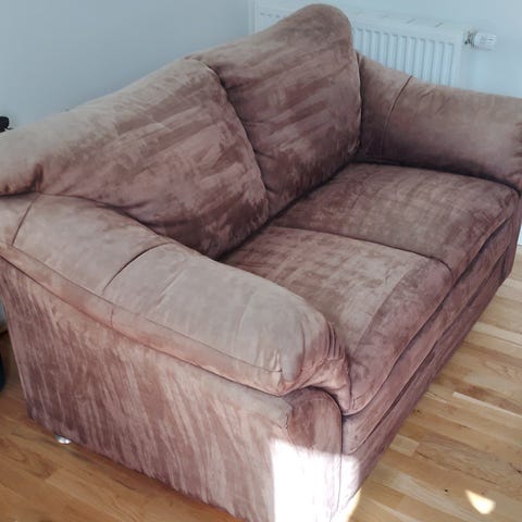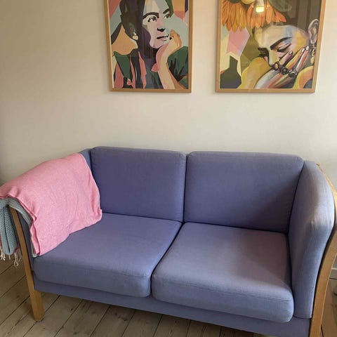 Blå sofa til 2 personer med stofbetræk. Sofaen har en enkel og funktionel design, velegnet til stue eller opholdsrum.