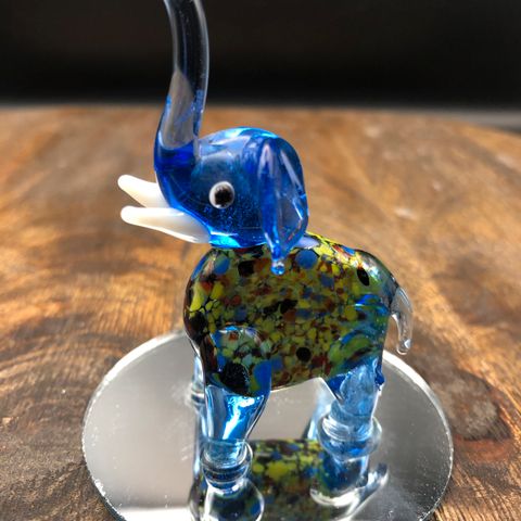 Multifarvet glaselefant med åben mund. Super stand. Mål: h: 13, l: 16 og bredde: 8 cm. Pris: 100 kr kontant.