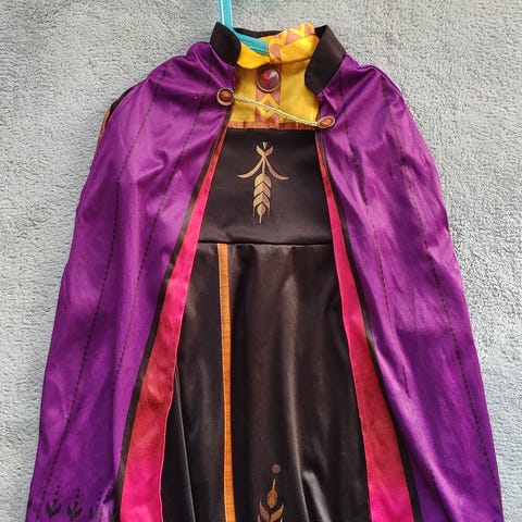 Anna kostume (Disney Frost), inkl. kappe. Kostumet har været flittigt brugt og har brugsspor, inkl. nogle pletter på det ene ærme (se foto), men fungerer som det skal. Lukkes med velcro i ryggen og kappen lukkes med en hæfte.