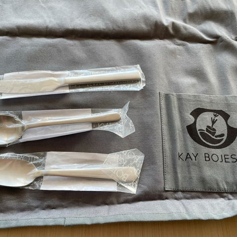 Fint børnebestik med hankeske (9 cm) og “opskubber” (9,5 cm), bestikserien Grand Prix designet af Kay Bojesen, mat rustfrit stål, rigtig fin stand - næsten som ny…