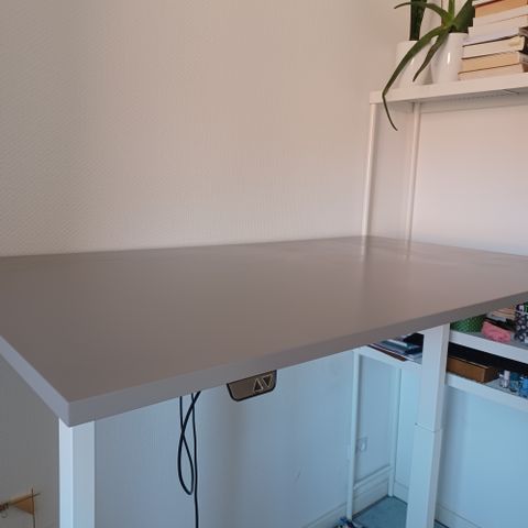 IKEA RODULF hæve-sænkebord med grå bordplade og hvidt stel. Bordet har elektrisk justerbar højde med kontrolpanel. Velegnet til kontorbrug eller hjemmearbejdsplads. https://www.ikea.com/dk/da/p/rodulf-skrivebord-haeve-saenke-elektrisk-hvid-s59530328/
