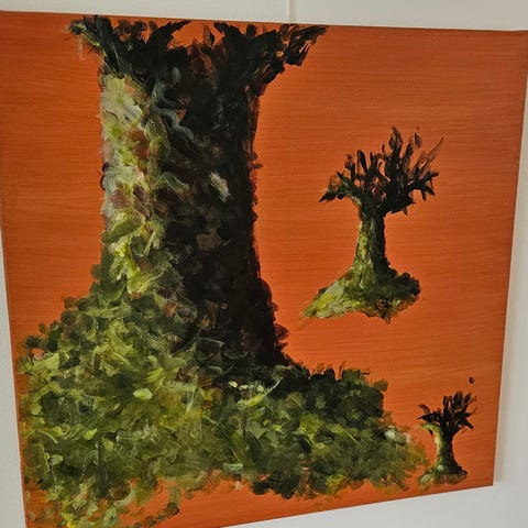 2 araer i træet. Maleri af Hanne G. Dahlerup. (hgdahlerup.net)