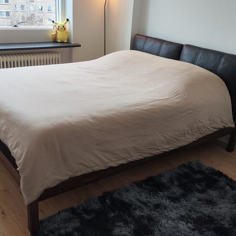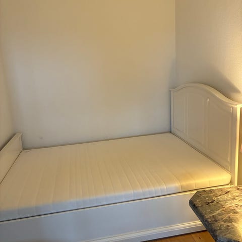 En Queensize seng fra USA med top madras og ramme med sengevæg.