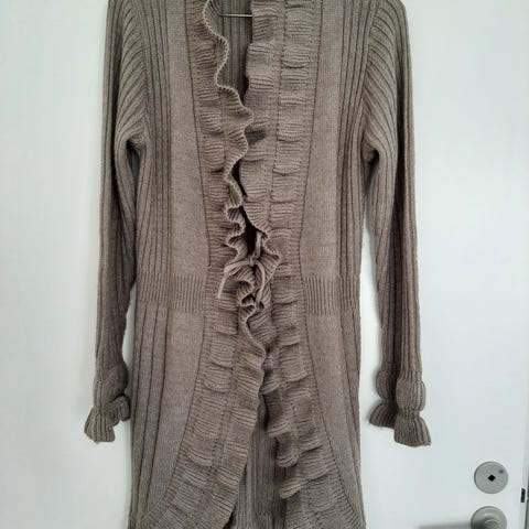 FREE QUENT Lækker grå Cardigan med silke kant., str. 38. God facon og længde.