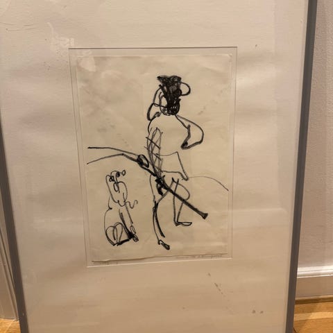 Original tegning af Bentemarie Kjeldbæk signeret og dateret 2001. Tegningen er indrammet med en enkel hvid passepartout og en tynd aluramme.